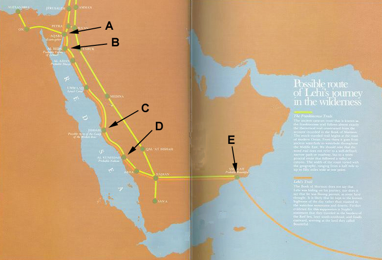 Scan of Hilton and Hilton, In Search of Lehi's Trail (1976), pp. 22-23, showing Arabian peninusla, with hypothesized journey of Lehi from Jerusalem to Old World Bountiful. Labels in large letters added for readability.